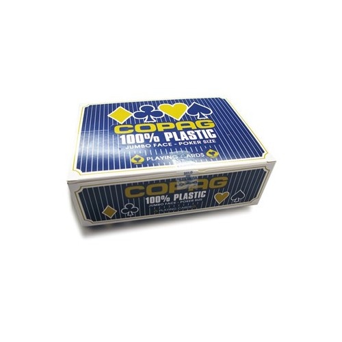 COPAG Cartes 100% plastique - Format : Poker - Cartes séléctionnées pour le WSOP - Jeu de 55 cartes (dont 2 jokers + 1 carte description de garantie) - Format : Poker - Index : 4 / jumbo - Packaging boite carton emballée sous film plastique - Cartouche comprenant 12 jeux bleus format poker index jumbo